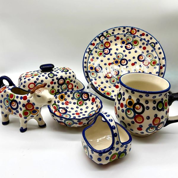 The most iconic Polish Pottery pattern. Deep cobalt circles (often ringed in green or red) stamped in repetitive, eye-catching symmetry — said to bring good luck and ward off bad vibes.